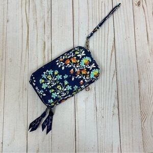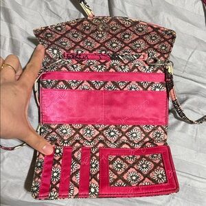 A small quilted fabric coin purse designed with an ID pocket, a zippered closure, and a lobster clasp for easy attachment to keys or bags.