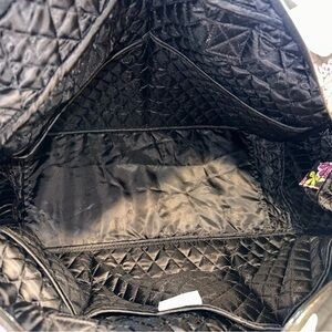 This super cute travel bag is in very good condition and ready for your trip. The front of the bag has two large slide pockets on the outside, and the back of the bag has two additional slide pockets, and a section for the handle of a roller cart. the main compartment has a double zipper closure and inside are for additional slide pockets to organize your things. There is an adjustable strap that is removable and handles for those moments when you don’t want to use the strap.