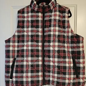 Full Zip Cozy Puffer Vest with Fleece Interior, Two Fleece Lined Zip Pockets. Red, Black, and White with Oversized Quilting Details. Warm for Cool Weather and Windy Days. Polyester Fabric. In Excellent Condition.