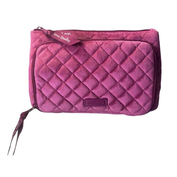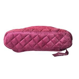 Add a pop of color to your travel routine with this Vera Bradley quilted plush cosmetic bag. Crafted from soft, velvety fabric in a rich raspberry pink hue, it features the brand’s signature diamond quilting and floral paisley interior lining. Multiple zip compartments and mesh pockets keep your essentials organized—perfect for makeup, toiletries, or travel accessories.