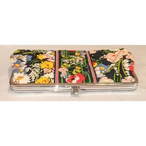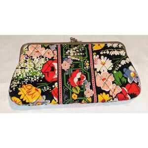 This is a Vera Bradley Poppy Fields Clutch Wallet with a Double Kiss Lock and Two Separate Compartments. Each side has card slots and storage. A Lovely Multicolor Floral Cotton Fabric. Brand New Without Tags. Measures 8.5" x 3.5". Please see pics for details.