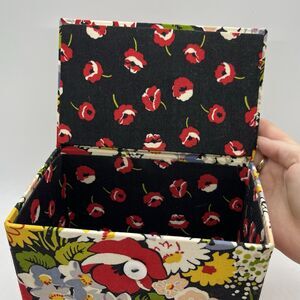 This is a Vera Bradley fabric lined storage box in the pattern Poppy Fields. Perfect size for recipe cards but could be used for a variety of storage. Box is dirty on the bottom and has fibers stuck to the inside, all pictured. Measures 6.5" long, 5" tall, and 4" wide.