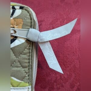 This wallet is made from Vera Bradley's signature quilted cotton, which is lightweight & packable. It can typically be spot cleaned with mild detergent and laid flat to dry.