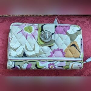 This wallet is made from Vera Bradley's signature quilted cotton, which is lightweight & packable. It can typically be spot cleaned with mild detergent and laid flat to dry.