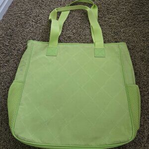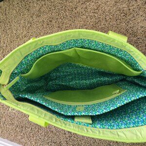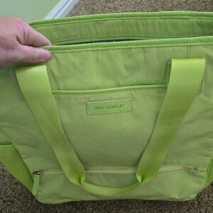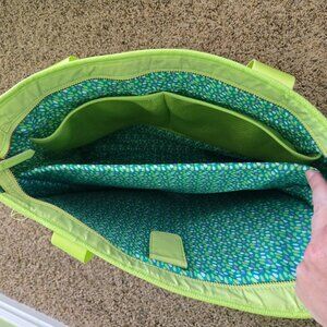 Vera Bradley Preppy Poly NoSo Tote. Great big bag with lots of room for all of your stuff. Multiple compartments in this bag. Front of the bag has a small slip pocket and at the bottom it has a long zipper pocket. On the inside of the bag in part it has 2 slip pockets that are mesh and 1 mesh pocket that is zippered. There is another compartment that you can put a laptop in as it padded. This is a great bag for work or school. There is wear and tear on the bottom of one corner as shown in the picture. On the sides of the bag on the outside there are mesh pockets on both sides great for keys or water bottles. Material is microfiber. Make me an offer.