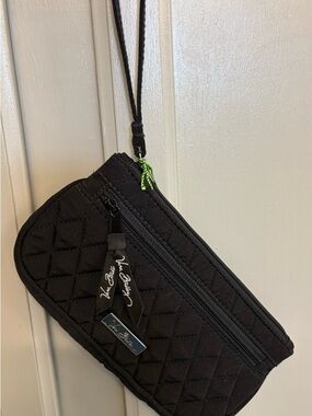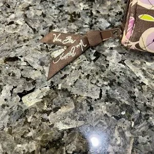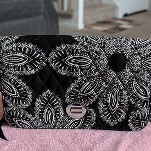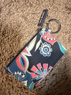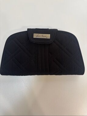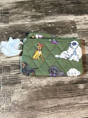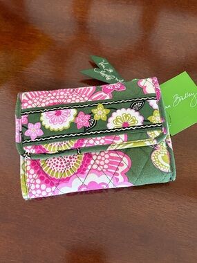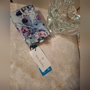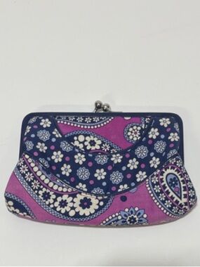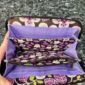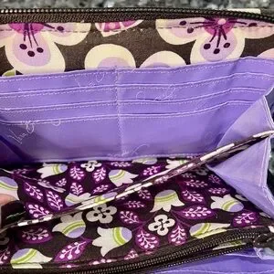 This Vera Bradley wallet showcases a charming purple and green floral pattern. Crafted from high-quality fabric, it offers a quilted design that is both stylish and functional. Ideal for everyday use. Wallet is machine washable. Measures 8x4.5