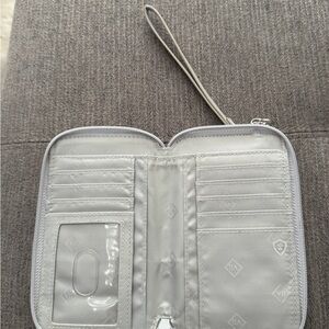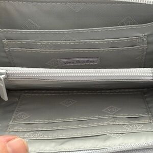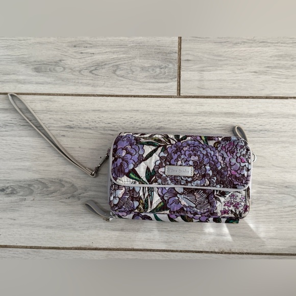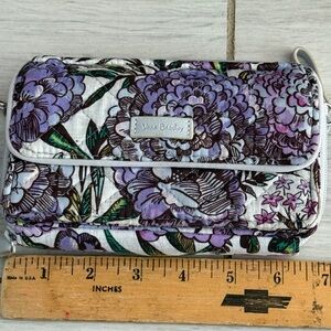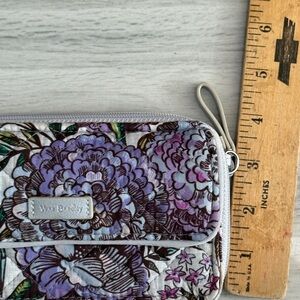 Stylish Vera Bradley wristlet. Features a vibrant purple floral pattern. Convenient wrist strap for easy carrying.