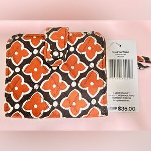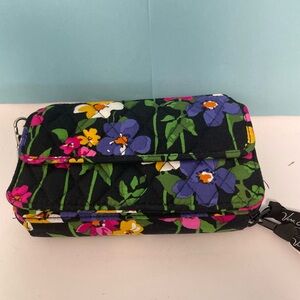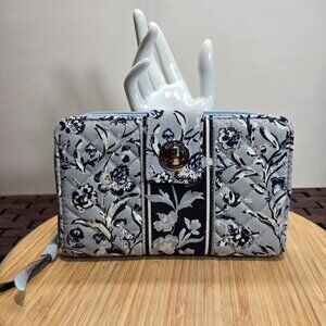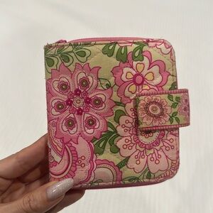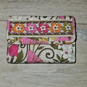Vera Bradley quilted tri-fold wallet with snap closure has two outside pockets, one zippered with Vera Bradley tags and one open with a snap closure. Interior has 7 slip pockets for cards plus one slip ID pocket and 3 larger slip pockets for additional cards or cash. It comes with a matching detachable lanyard with a keyring stamped Vera Bradley. The wallet measures about 6" x 3 1/2" and the lanyard is about 30" long. Pre-owned, gently used. One small stain detected. See pictures.