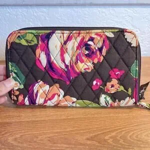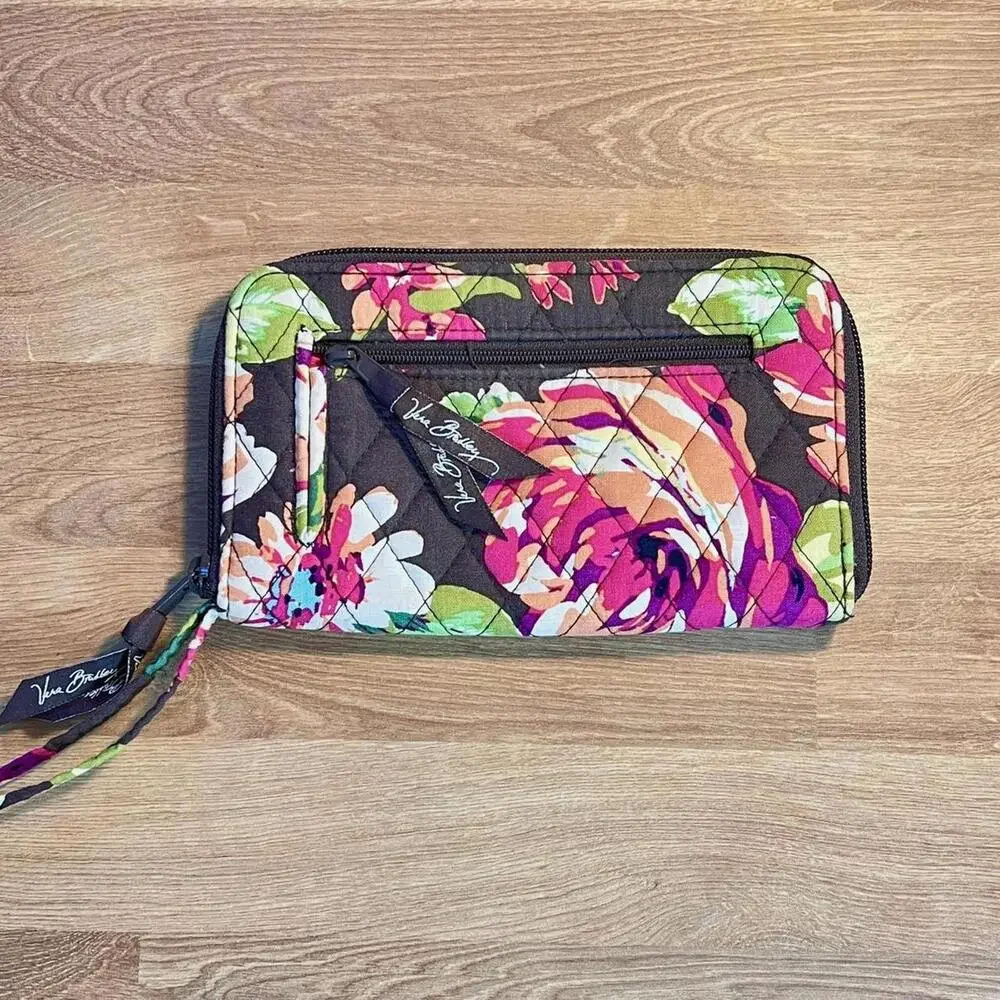 Cute quilted wristlet wallet in a multicolor floral print features a zip-around closure, wrist strap, exterior zip pocket, and spacious interior with multiple card slots and compartments. Fully lined in vibrant pink with classic Vera Bradley quilting—perfect for Y2K, boho, or colorful everyday looks.