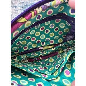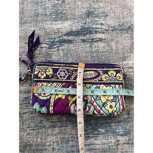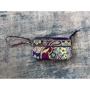 Quilted wristlet wallet from Vera Bradley. Pretty paisley green and purple floral print is called "Heather". Side of the bag has a lobster clasp that can be attached to a keychain/purse/bag or looped on itself and worn on the wrist. Purple Vera Bradley ribbon on zipper pull.