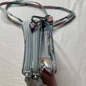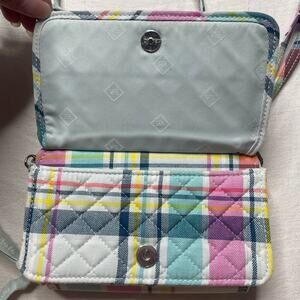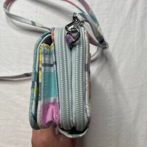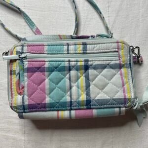 Vera Bradley RFID All in One crossbody bag in the pastel plaid color. Features a quilted fabric, removable strap, back exterior zip pocket, and card slots. Good preowned condition, no notable flaws.