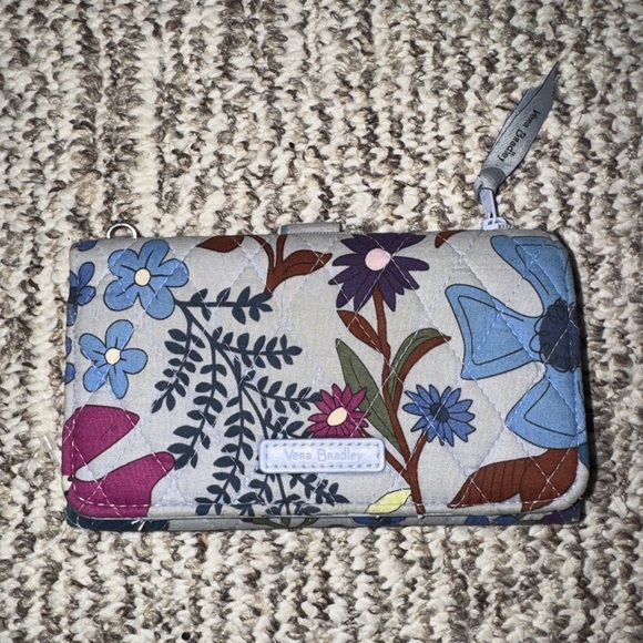 Charming wallet with floral and leaf patterns. Features blue, purple, and pink accents. Compact and stylish design. #verabradley #rfidprotected
