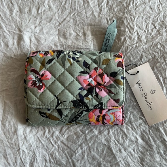 Excellent condition, NWT. Chic quilted wallet with floral pattern by Vera Bradley. Features green and pink hues. Perfect for everyday use. External zipper pocket. Internal zipper pocket. ID window. 13 card slots. Slip pockets.