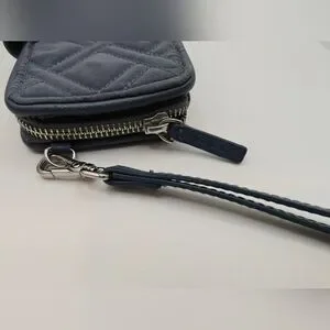 Compact quilted wristlet wallet in charcoal. Dual zip compartments. Removable wrist strap and snap tab closure. Sleek and versatile for everyday use.