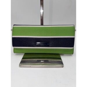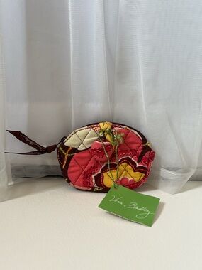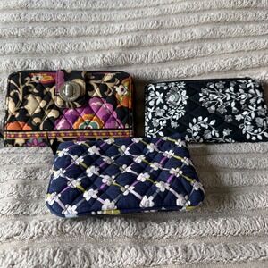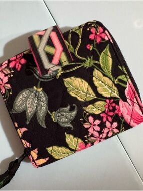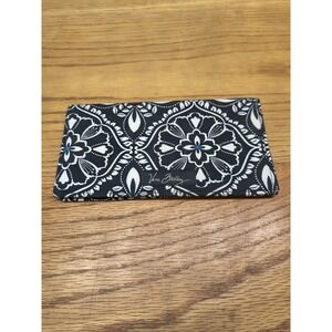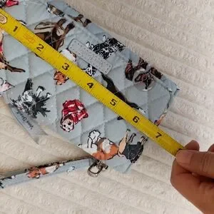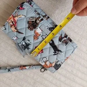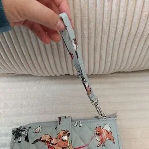 Quilted wristlet wallet with playful dog print. Light blue background with multicolored dogs. Metal Vera Bradley logo plate. Compact and stylish. Easy wrist strap for carrying.