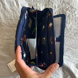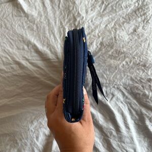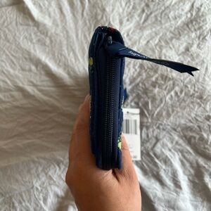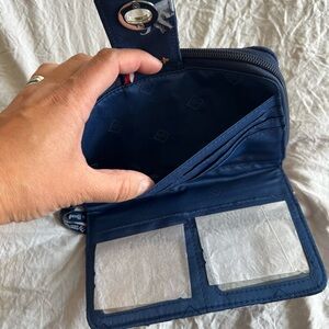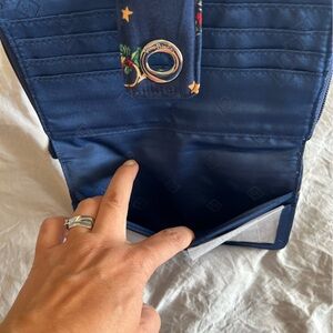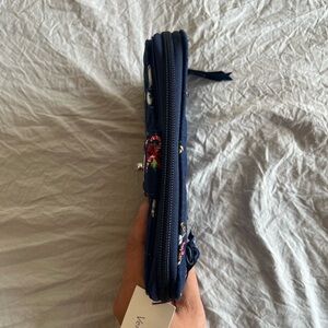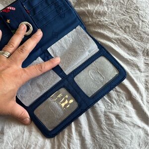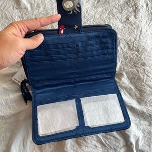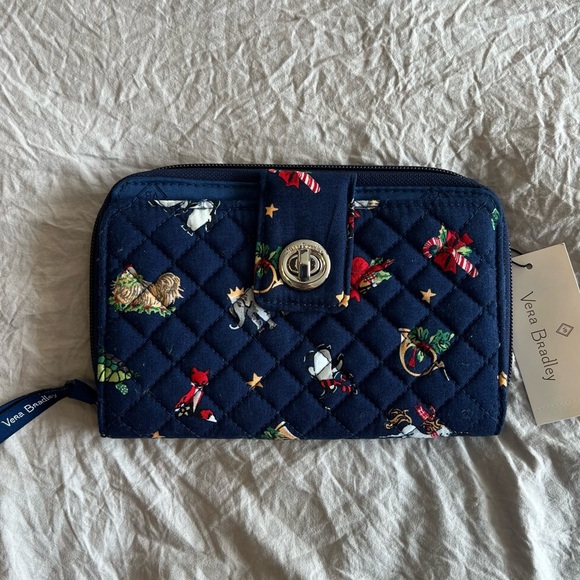 Excellent condition, NWT. Vera Bradley. Charming navy quilted wallet with vibrant animal designs. Features a secure turn-lock closure. Exterior zipper pocket. 2 interior ID windows, 6 card slots, slip pockets. Additional zipper compartment with 6 more card slots and storage.