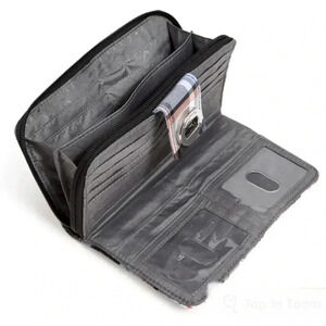 Two expandable compartments in the zip around section and a front section with turnlock closure house two ID windows, numerous card slips and a zippered coin pouch keep cash, cards and everything else organized.