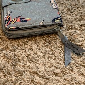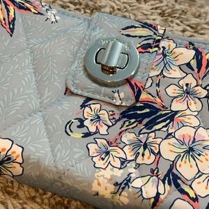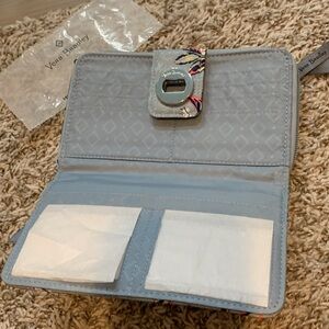 Vera Bradley Ultralight RFID Turn-Lock Wallet. Durable wallet. Tri-fold design. Wallet pockets aplenty for ID, cards, etc. Interior has standard wallet pockets and 2 ID windows. Exterior has one zip pocket. Turn-Lock and zip double closure keeps everything doubly secure. Signature cotton is lightweight and Packable. Wallet is machine washable. RFID-blocking technology. Measures approximately: 8”W x 4.75”H x 1”D.