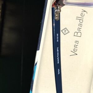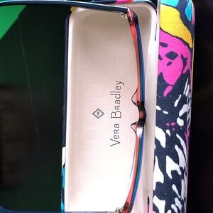 Stylish multi-color "Tamlyn" rectangle eyeglasses and case by Vera Bradley. Frames are mainly blue w/ baby pink outline in front, w/ colored design on sides. Lenses can be swapped out, but last photo is of current prescription of lenses included for comparison. EUC, no flaws!