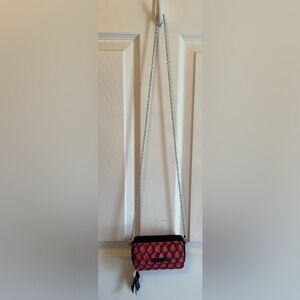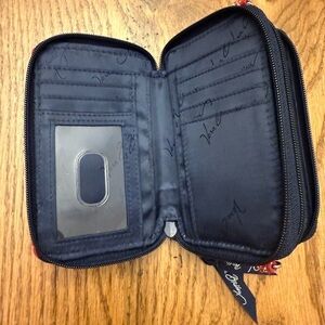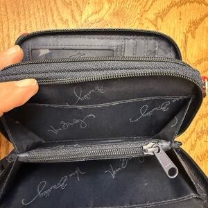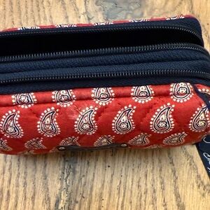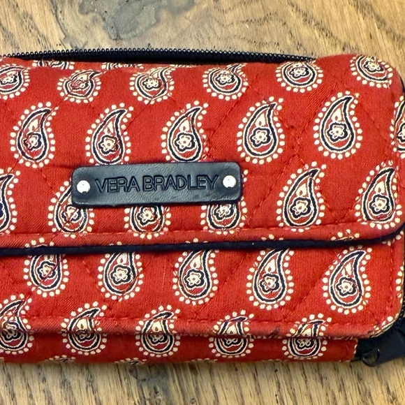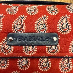 Stylish Vera Bradley wallet with a red paisley pattern. Perfect for organizing essentials. Vera Bradley wallet had three sections. The strap/chain is 22 in he’s drop. 5 3/4 inches wide by 3 1/2 inches tall. Bottom is 5 inches wide and 3/4 inches tall In the front is a snap pouch with a section for credit cards and money or whatever you choose and the back section is two pouches and another 2 tiny pouch against the walls of the interior and a zipper in the middle for a change and money. Bradley Signature is engraved in leather on the front. No tears or stains. Perfect condition.