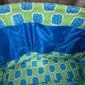 Vera Bradley retired 2012 Doodle Daisy messenger or crossbody style bag with a quilted cotton exterior and a vibrant floral pattern in blue and green hues. It features a padded, adjustable shoulder strap, a buckle closure under the flap, and multiple pockets for organization, including a back zipper pocket and interior and pencil pockets.