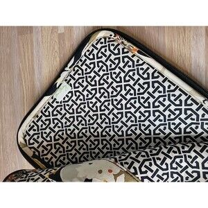 Add a touch of floral charm and iconic style to your tech accessories with this Vera Bradley quilted tablet or e-reader case. Featuring a bold black background adorned with blooming white, mustard yellow, and coral-hued flowers, this case combines fashion with function. Measuring approximately 10 inches by 8 inches, it offers a padded, zip-around design for secure protection. The interior is lined with a contrasting geometric print and includes a small floral patch pocket for added organization. The zipper pull is accented with a black ribbon tag printed with the Vera Bradley logo in white script. This case is perfect for holding tablets, e-readers, or other small electronics and makes a stylish, lightweight option for everyday protection.