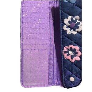 This Vera Bradley trifold wallet features a quilted cotton floral design with a purple lining and organized interior layout. It is in excellent pre-owned condition with no noted flaws.