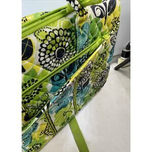 The Vera Bradley Retired Large Quilt Lap Top iPad bag in the Lime's Up Yellow Green pattern is a stylish and practical accessory for women on the go. This medium-sized rectangular bag features a zip closure, green handles, and a quilted finish with a floral pattern. The lined interior offers inner and outer pockets for organization, while the cotton exterior and lining provide durability and comfort. Perfect for travel, parties, casual outings, work, or business, this shoulder bag from the Vera Bradley Lime's Up collection is a vibrant and functional addition to any wardrobe.