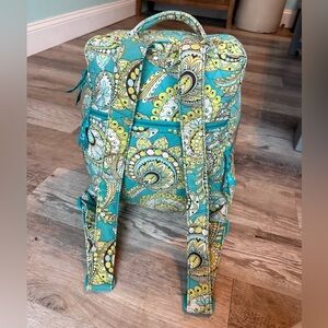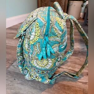 Vibrant paisley backpack with a mix of teal, yellow, and white patterns. Perfect for everyday use.