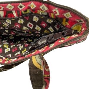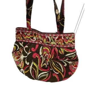 This Vera Bradley Puccini shoulder bag is the perfect accessory for any colorful outfit. The retired style bag features a beautiful floral pattern and comes in a medium size with a zip closure. The handle/strap color is multicolor and the bag has pleated accents. The bag has inner pockets and outer pockets, is lightweight, and has a depth of 8 inches. The exterior color is also multicolor and the lining color is multicolor. This bag is perfect for any woman who loves flowers and colorful designs. Item is in very good pre-loved condition.