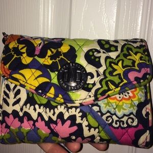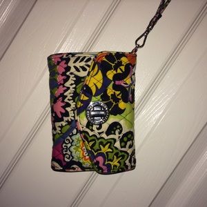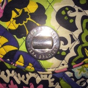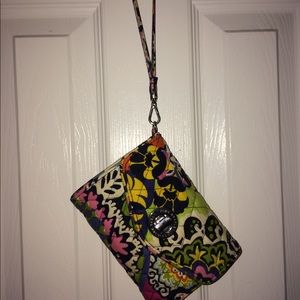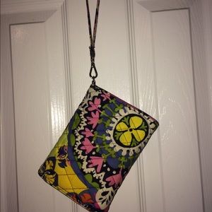 This Vera Bradley wristlet is the design call Rio. It has a turn to open little notch and a wristlet handle you put on your wrist that you can remove or leave on. In the inside there is a zipper that you can put your coins in and there are slots for cards and other slots for cash.
