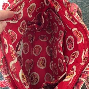 A classic Vera Bradley signature cotton shoulder bag. The red, pink and cream quilted paisley print, called Rosy Posies, is colorful and casual. The exterior has a pocket on one side and the interior has three pockets on each side. Great for your keys or cellphone. The zip top keeps everything secure. Gently worn and in good condition. The shoulder handles are approximately 22” from side to side. The bag itself is approximately 14” long x 10” tall x 4.5” deep. Pair with the matching wallet in my closet for 10% off your complete bundle.