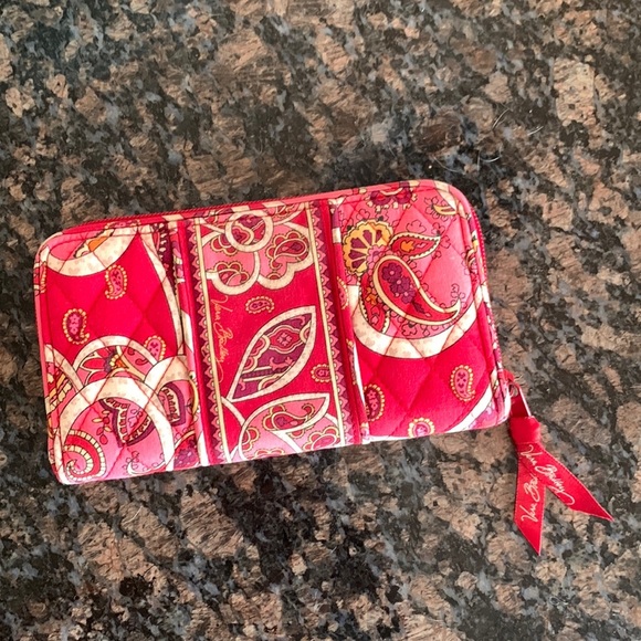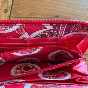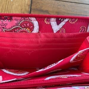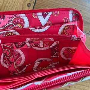 A classic Vera Bradley signature cotton accordion wallet organizer with surround zip. The Rosy Posies signature red and cream paisley design features 14 credit card slots with a full length bill organizer, zipped coin pouch and Drivers License/ID slot with easy access. Great condition. Hardly used. Approximately 7.75” long and 4.5” tall. Matching shoulder bag available in my closet. Get 10% off when you bundle the two.