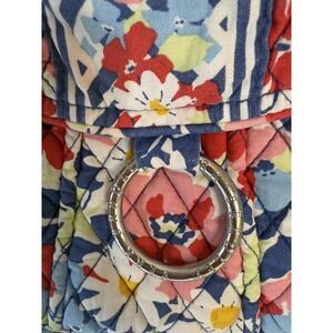 The Vera Bradley Saddle Up Bag is a medium-sized handbag with a beautiful Floral Cottage print in silver. This adjustable strap bag features a magnetic closure and is made of cotton fabric, with a multicolor lining. The exterior and lining of the bag are both adorned with a colorful floral pattern, perfect for adding a touch of style to any outfit. The silver hardware adds an elegant touch to this classic and colorful saddle bag from Vera Bradley's Vera Hope collection. See photos for details.