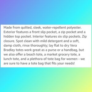Vera Bradley Seawater Blossoms tote in excellent condition. Water repellent polyester. Zipper closure. Padded laptop sleeve and pen slips. Trolley sleeve and lots of pockets. Spot clean.