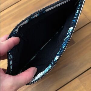 Top Zip Closure. Inside has a zip wall pocket. An attached wrist strap on zipper head
