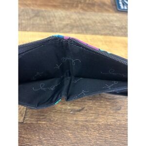 Vera Bradley small zip-around wallet in a vibrant floral and geometric pattern on a black quilted background. This compact accessory features a secure wrap-around zipper closure and an exterior zippered coin pocket for easy access. The interior is thoughtfully designed with several card slots, an ID window with a thumb slide, and a full-length bill compartment lined with signature Vera Bradley script fabric. Perfect for organizing essentials in a slim, travel-friendly profile.