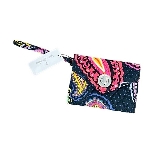 Vera Bradley Smartphone Wrislet Twilight Paisley Turn Lock Wallet Colorful Blue Pink. 6.25" W x 5" H x 1"D. 100% Cotton. Features: Turn lock closure, 3 inner compartments, credit card slits, zipper pocket. Item in excellent NWT condition. No known rips, tears, holes, stains or defects. This is a first quality item.