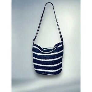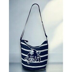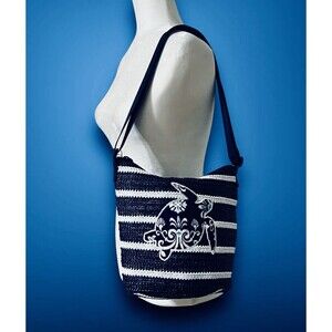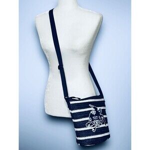 This Vera Bradley Straw Bucket Crossbody bag is perfect for any beach or nautical outing. It features a zip closure, adjustable crossbody strap, and interior pocket.