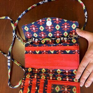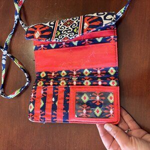 This authentic Vera Bradley crossbody wallet/mini hipster is in the "Sun Valley" retired pattern. The bag features a vibrant combination of navy blue, orange/red, and white, with a quilted exterior.