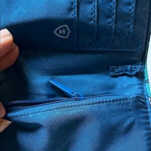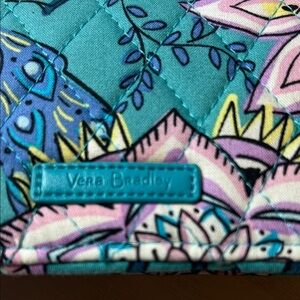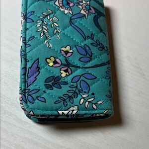 Charming quilted wallet with floral patterns. Features teal and pink hues. Compact and stylish design.