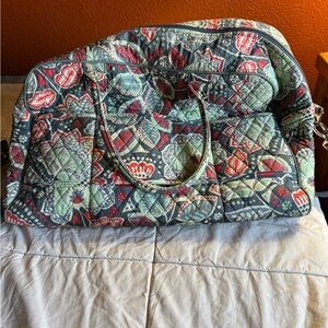 Vera Bradley Travel Duffel, gym bag, Blue Green Red Floral, large. Similar to the weekender. Slip-through pocket on the back for use with a roller bag, zippered front pocket, 2 pockets on the back side, and multiple pockets inside. Very good used condition aside from a stain on the bottom inside (see pics for details).