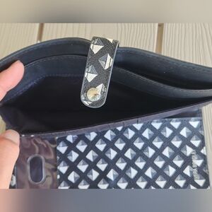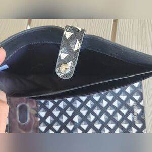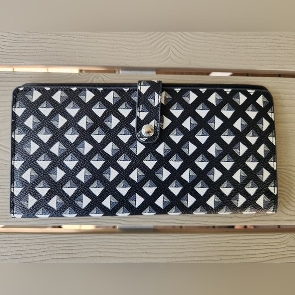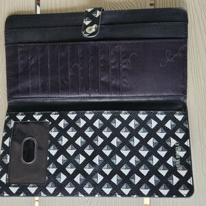 Vera Bradley travel organizer wallet in EUC, 9" W x 4.5" H when closed, 9" x 9" when opened. I believe it's faux leather. Slight scuff on the snap.