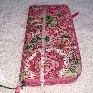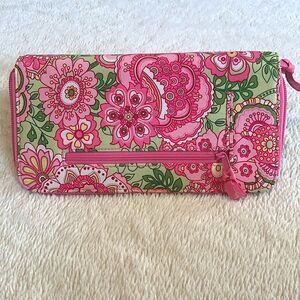 Vera Bradley Travel Organizer in Petal Pink *small stain on inside (see picture) Great for daily use & even better for travel. Features an outside pocket for airline tickets, an inside ID window, slots for credit cards, a sleeve for bills, & a zip pocket for coins. This Travel Organizer zips completely around.