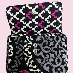 This is a stylish Vera Bradley quilted cotton tri-fold wallet featuring a bold black, pink, gray, and white pattern with signature satin interior lining. It offers excellent organization with multiple compartments and a compact, easy-to-carry shape.