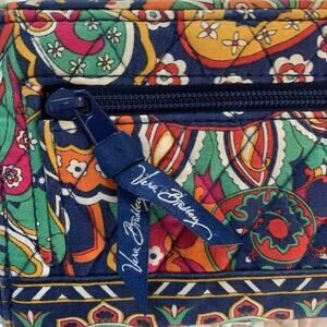 This Vera Bradley Turn Lock Wallet in the Venetian Paisley pattern is a retired and hard-to-find piece for women who appreciate unique and stylish accessories. Made of cotton material, this wallet features a zip-around design with credit card slots, making it both functional and fashionable. The multicolor paisley pattern adds a touch of flair to the wallet, making it a standout accessory for any outfit. Perfect for adding a pop of color and style to your everyday carry. The wallet measures approximately 7.75x4.5x1 inches.