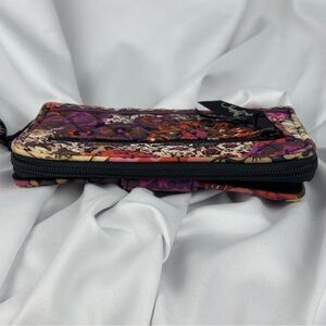 This is the Vera Bradley Turn Lock - Zip around Wallet - RoseWood - Good Condition. The wallet is in good condition and is pre-loved. There are some signs of wear on the exterior of the rounded corners of the wallet. Cotton Pattern is called "Rose Wood". Exterior colors are purple, red, orange, brown, dark green, white, dirty cream, pink.