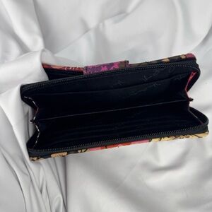 This is the Vera Bradley Turn Lock - Zip around Wallet - RoseWood - Good Condition. The wallet is in good condition and is pre-loved. There are some signs of wear on the exterior of the rounded corners of the wallet. Cotton Pattern is called "Rose Wood". Exterior colors are purple, red, orange, brown, dark green, white, dirty cream, pink.