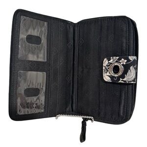 This wallet features a black background with a floral and paisley design in shades of white, gray, pink, and blue. It has a turn-lock closure on the front flap and a zip-around compartment.