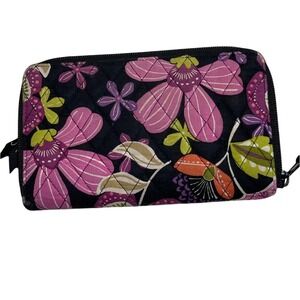 A Vera Bradley cotton quilted turnlock wallet/clutch in a bold floral pattern with a rose colored lining on the interior. The wallet features two ID windows and multiple credit card slots. The other side opens by a zip around and has areas for bills, coins, credit cards, etc. with one additional zippered compartment on the back. Measures approximately 8”X 5”. In great condition with small signs of wear on the lock.